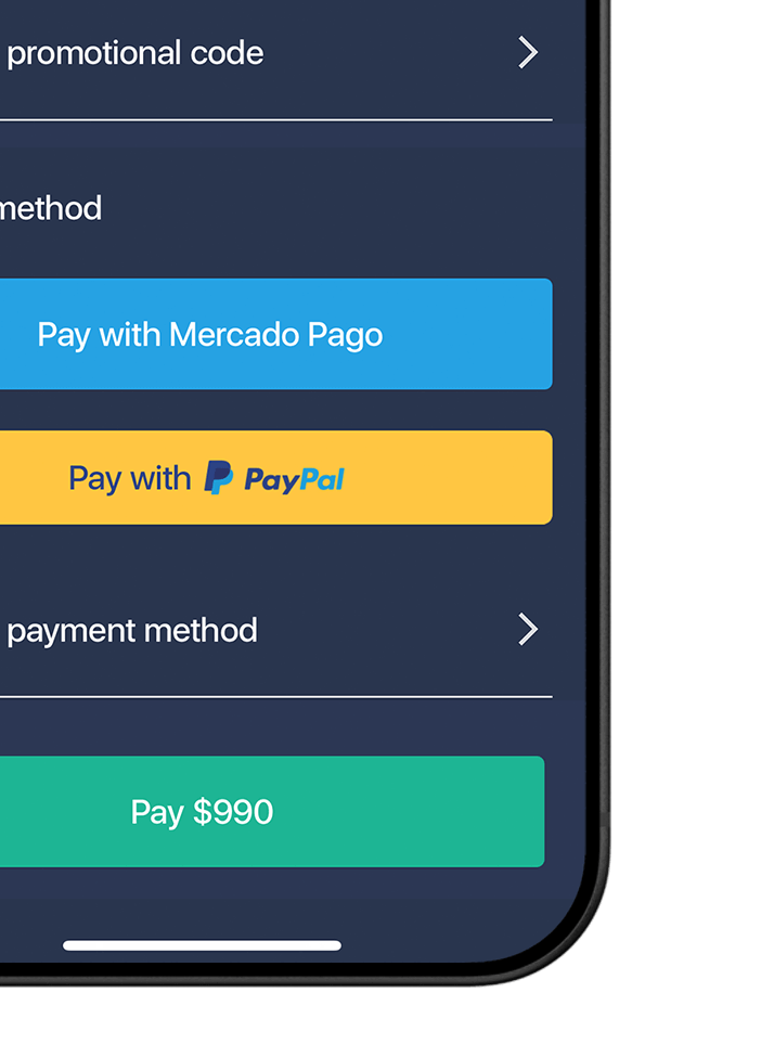 Pantalla de opciones de pago con botones para pagar con MercadoPago, PayPal y un botón para pagar $990.